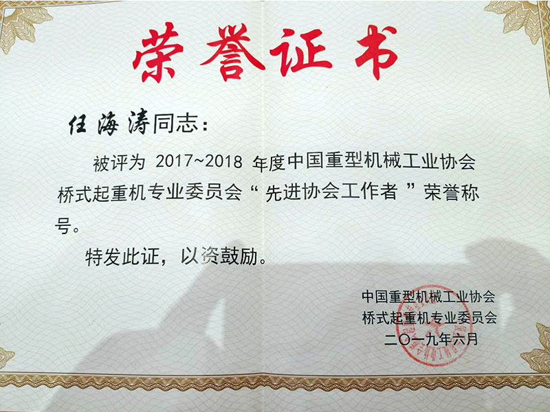 會上,表彰了2018年度全國企業(yè)。河南礦山再次榮獲“門式起重機(jī)生產(chǎn)企業(yè)”榮譽(yù)稱號,此前,公司已多次獲得該項(xiàng)榮譽(yù);公司總經(jīng)理任海濤榮獲2017-2018年度中國重型機(jī)械工業(yè)協(xié)會橋式起重機(jī)委員會“先進(jìn)協(xié)會工作者”榮譽(yù)稱號。
